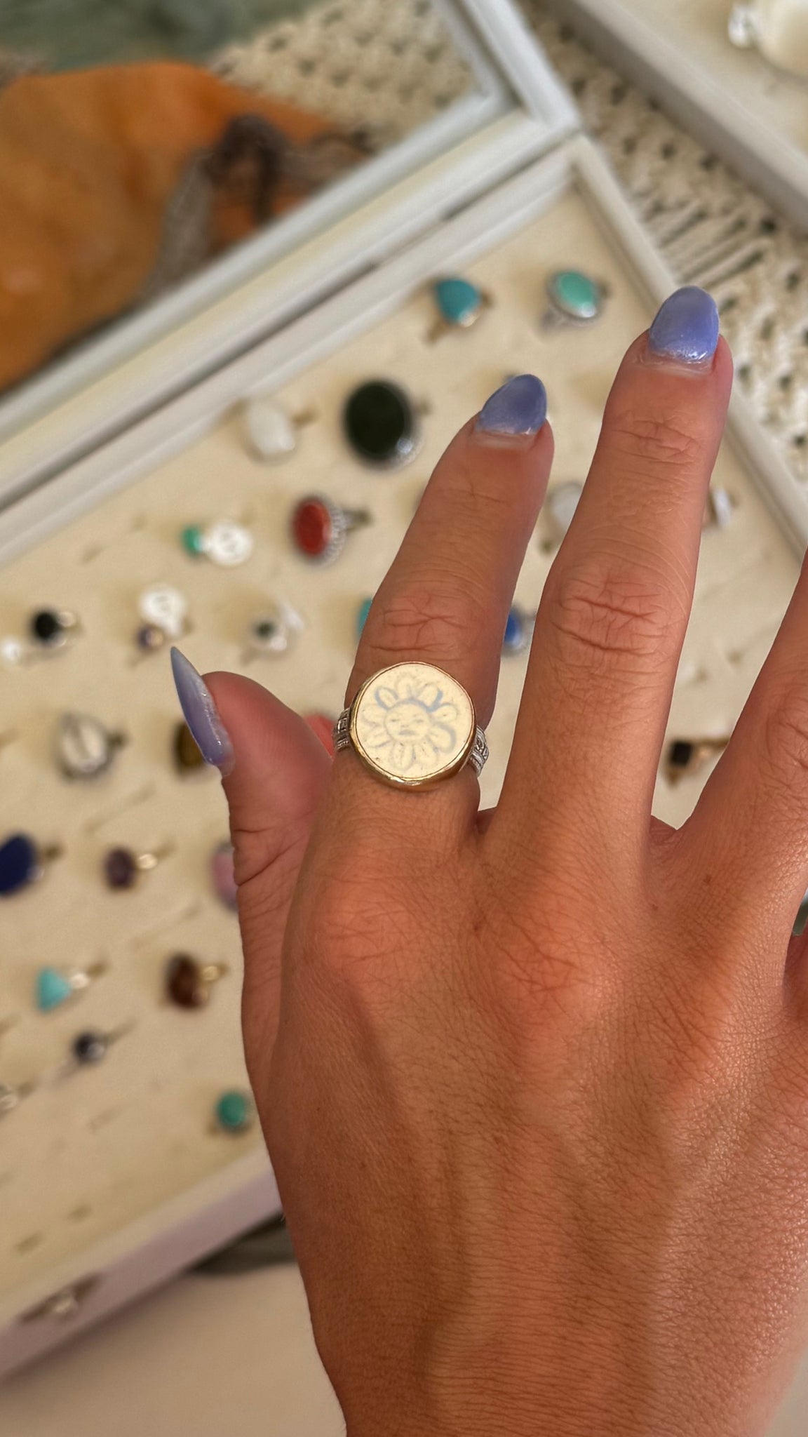 Handmade & hand painted Custom flower face gem in a simple, 14k Gold Filled setting with a chunky, .925 Sterling Silver band. Made in a size 8.5
