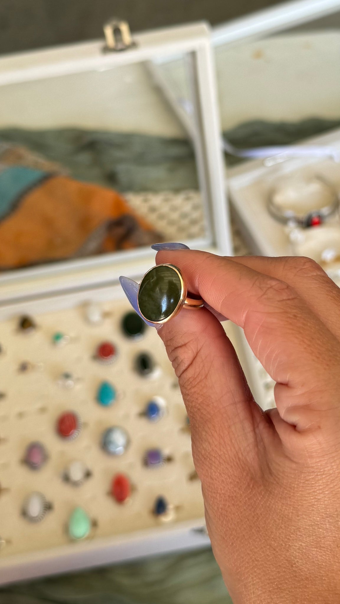 This Jade gemstone is Handcrafted into a 14k Gold-Filled gem ring, with a .925 sterling silver backplate for quality assurance. Made in a size 5!