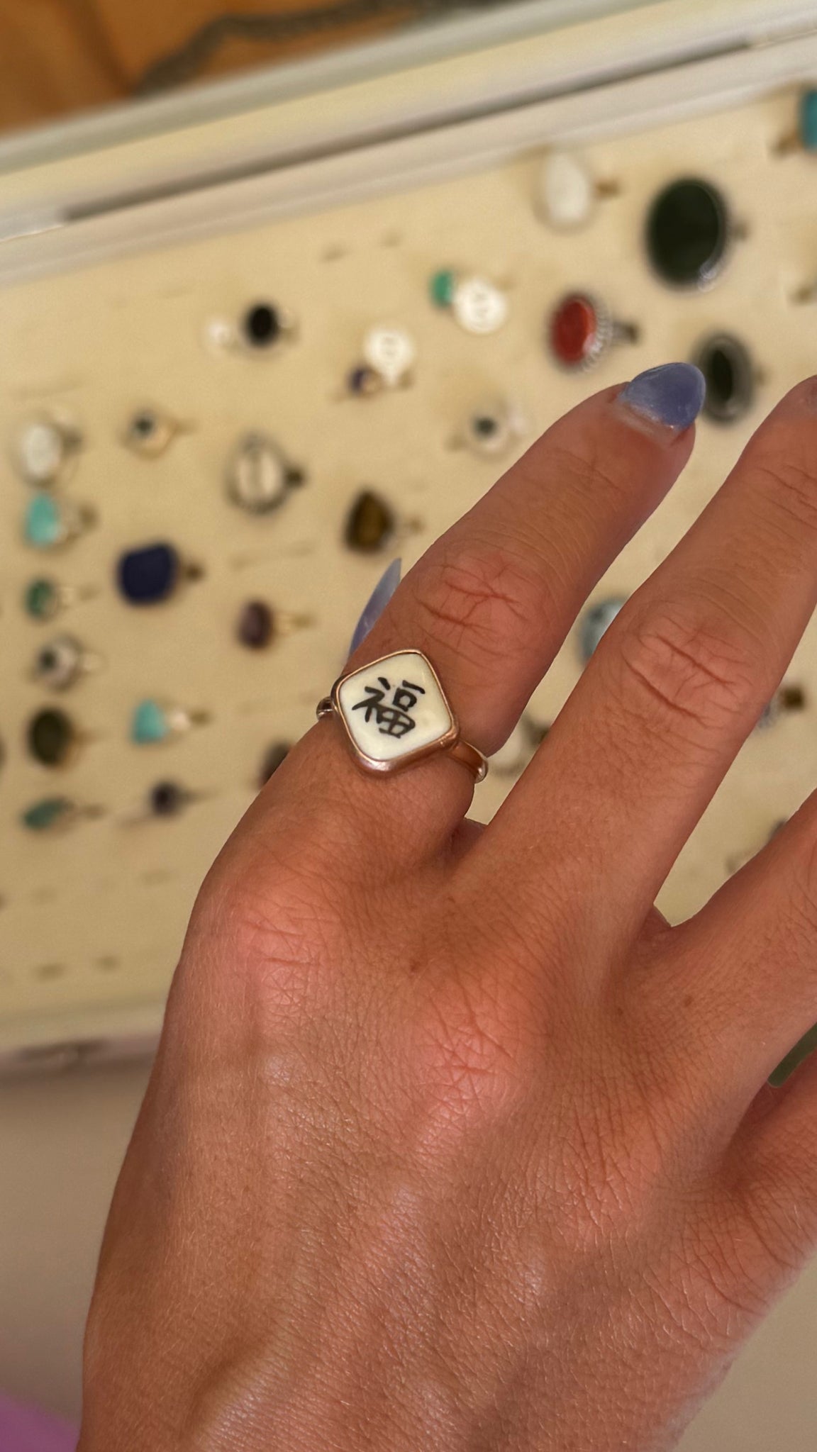 Ceramic, hand painted gem in a simple, 14k Gold Filled setting, with a .925 Sterling Silver backplate. Handcrafted in a size 8.75!